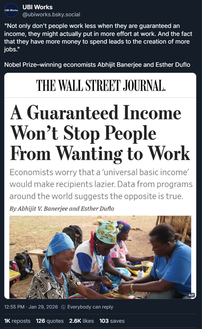 Basic income allows us to redefine our relationship to work and how we choose to contribute to society, and it’s clear this is what humanity wants. Follow us on Bluesky and help make viral pieces like this more common.